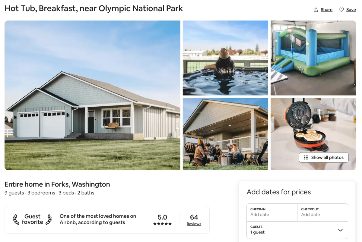 Through this process we discovered the town of Forks on the Olympic Peninsula. This small town had multiple traffic drivers being home to the popular Twilight book/movie franchise and more importantly a key basecamp for the 3 million annual Olympic National Park visitors. Our research showed high demand (particularly in the summer season) and affordable, but limited rental homes. An ideal recipe for a successful market.